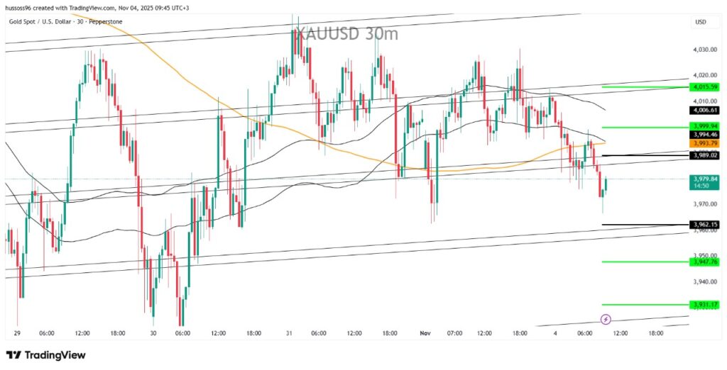 التعليق: الذهب يواجه مقاومة قوية قرب 3,990، وكسر 3,962 سيفتح الطريق نحو 3,930 بينما الثبات فوق 3,990 قد يعيد الاتجاه الصاعد المؤقت.
