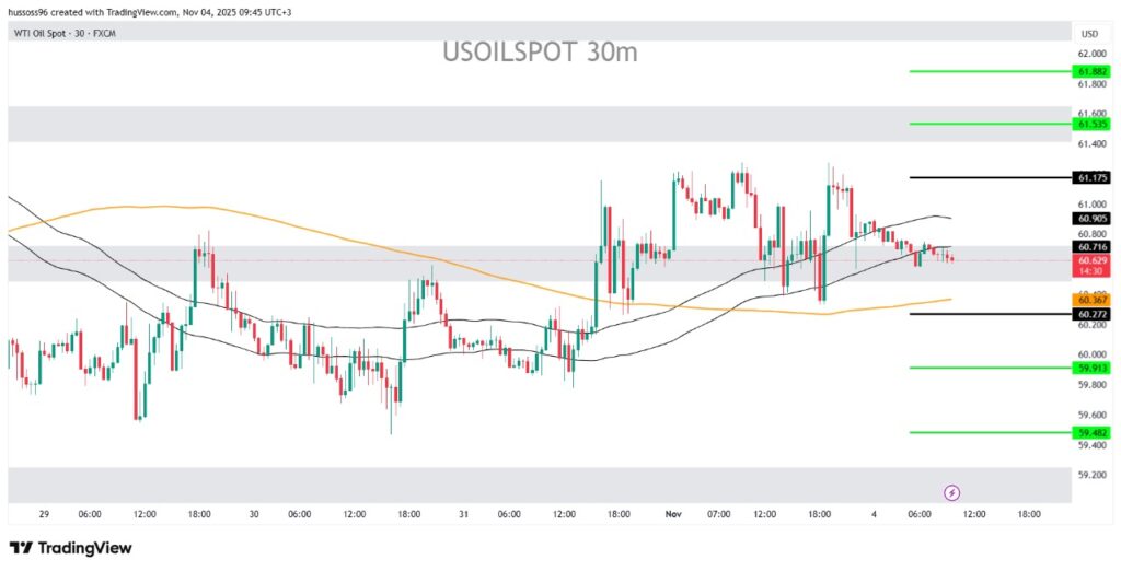 التعليق: النفط يتذبذب بين دعم 60.30 ومقاومة 61.20، وكسر أي من المستويين سيحدد الاتجاه القادم بوضوح.