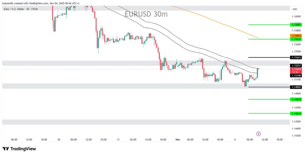 التعليق: اليورو يحاول التعافي لكن الاتجاه العام ما زال ضعيفاً، وأي كسر دون 1.1500 سيعيد السيطرة للبائعين بقوة.