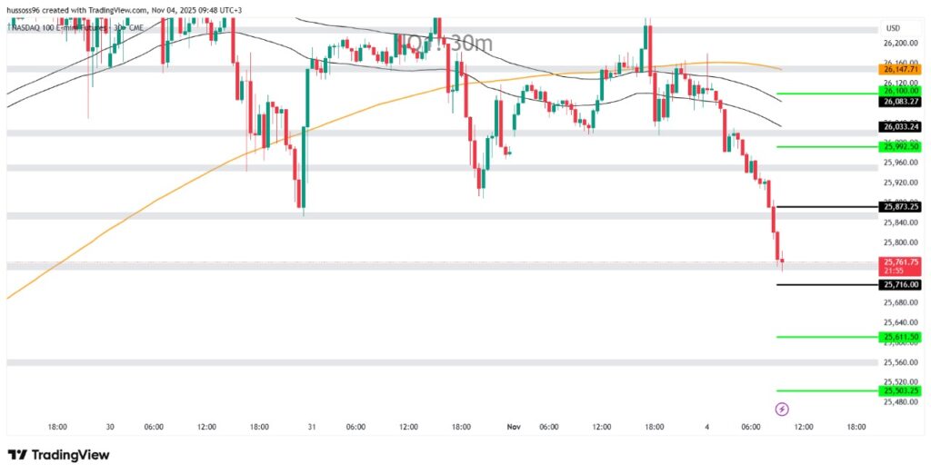 التعليق: استمرار الزخم البيعي الواضح على المؤشر مع كسر مستويات دعم متتالية، ويُرجّح استمرار الهبوط نحو 25,600 ما لم يتم اختراق 25,870 لاستعادة الزخم الصاعد.