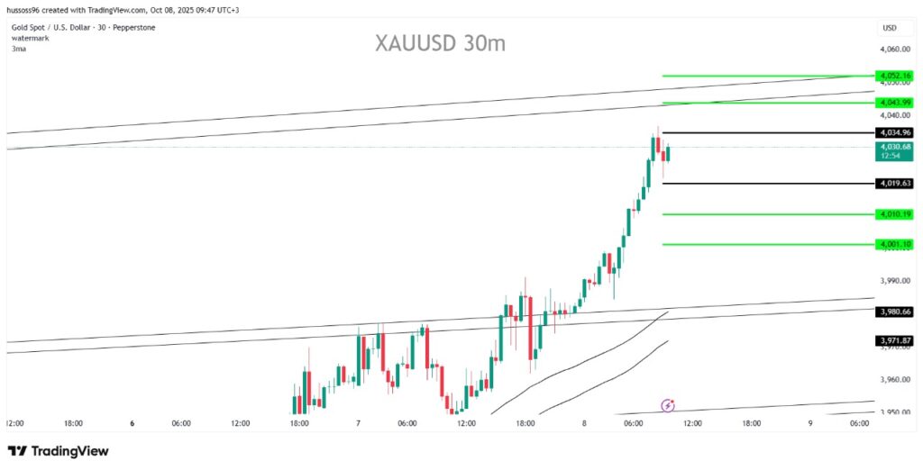 السيناريو الأول: شراء الذهب باختراق والثبات أعلى 4,035 مع استهداف 4,043 ثم 4,052