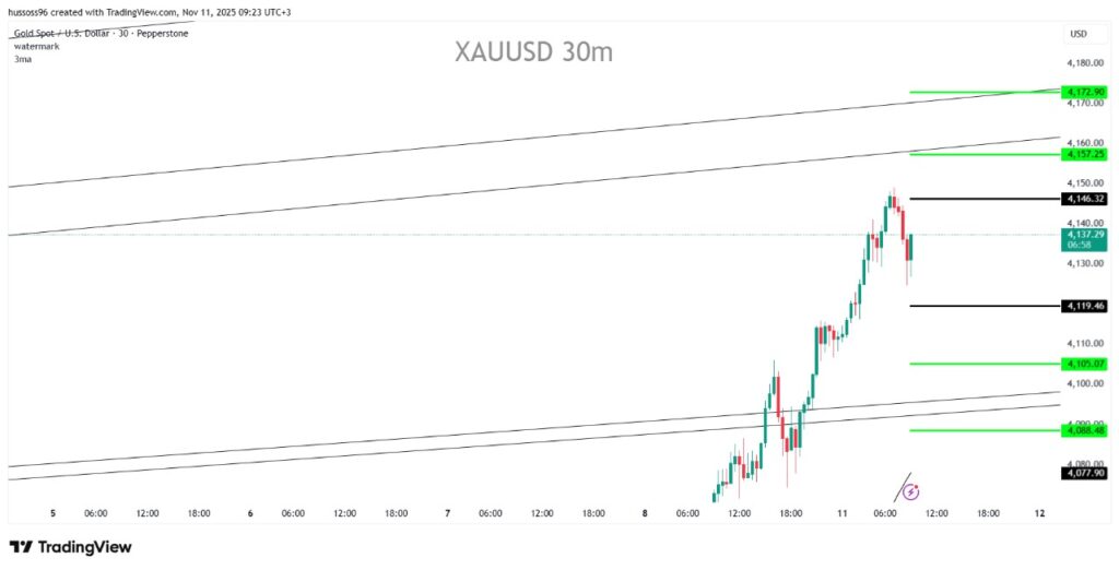 التعليق: الذهب يواصل الاتجاه الصاعد بعد موجة ارتفاع قوية من مستويات 4,080، مع مقاومة حالية عند 4,146. اختراقها يعزز المسار الإيجابي نحو 4,170، أما الكسر دون 4,119 فيفتح المجال لتصحيح محدود.