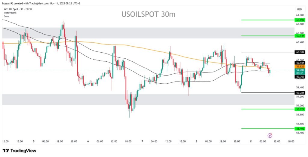 التعليق: النفط يختبر حالياً منطقة مقاومة عند 60 دولار، والفشل في تجاوزها قد يعيد الضغوط البيعية، بينما اختراقها يفتح المجال لاستهداف 60.80 مجدداً.