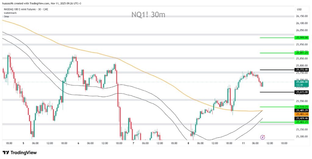 التعليق: مؤشر ناسداك يتذبذب بين نطاق ضيق بعد موجة صعود قصيرة، والثبات دون 25,770 يبقي النظرة الحذرة قائمة، بينما اختراقها قد يعيد الزخم الصاعد نحو 26,000.