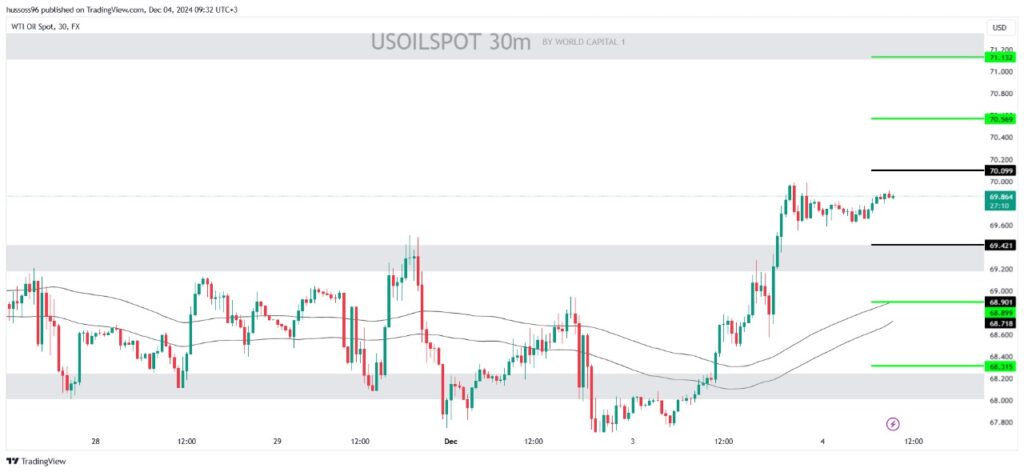 Scenario 1: Sell oil by breaking the $69.42 level, targeting $68.89 and then $68.31.