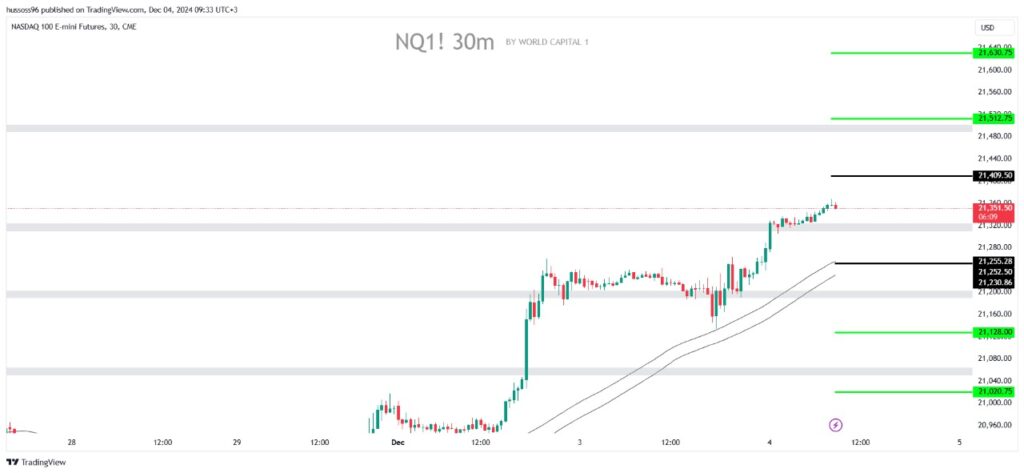 Scenario 1: Buy Nasdaq with a break and hold with a close above 21409, targeting 21512 then 21630